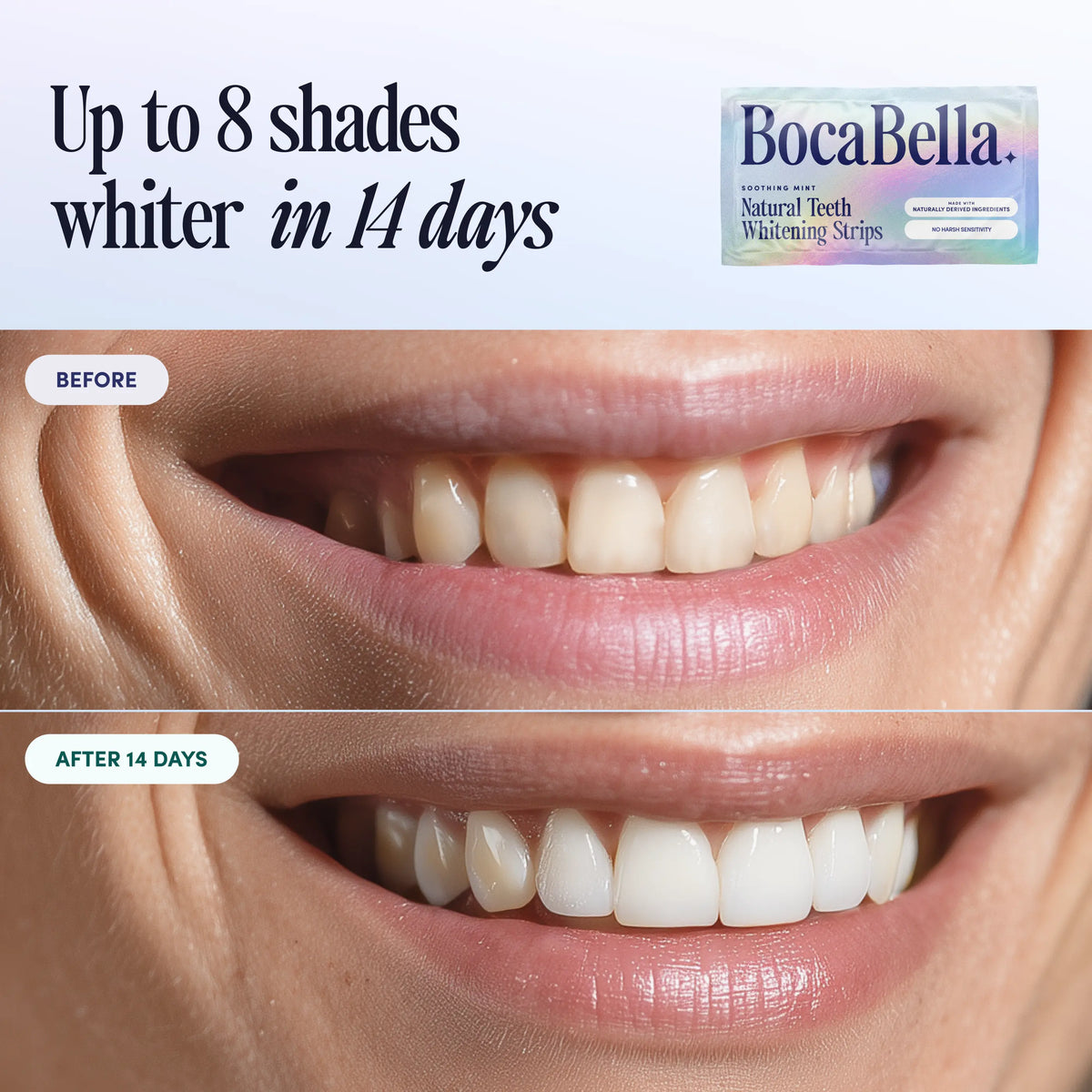 - Natural Whitening Strips are peroxide-free and ideal for sensitive teeth, using plant-based enzymes and polishing minerals to brighten gradually over time—up to 7+ shades in 14 days.